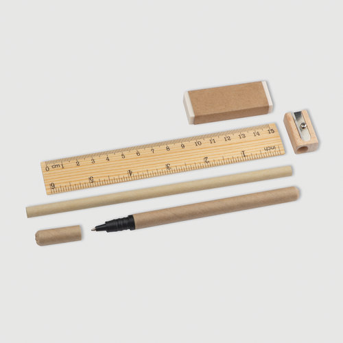 Bestaande uit liniaal, vlakgom, puntenslijper, potlood en rollerpen