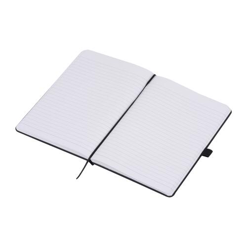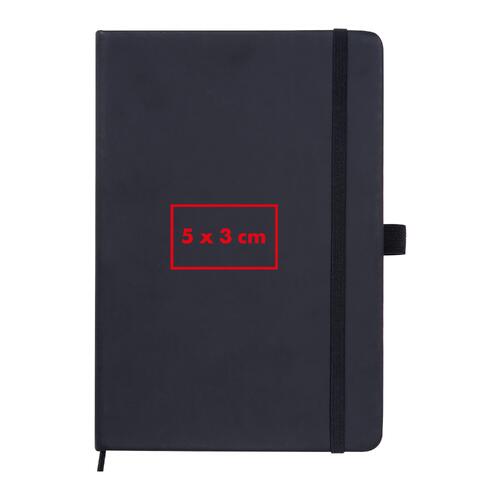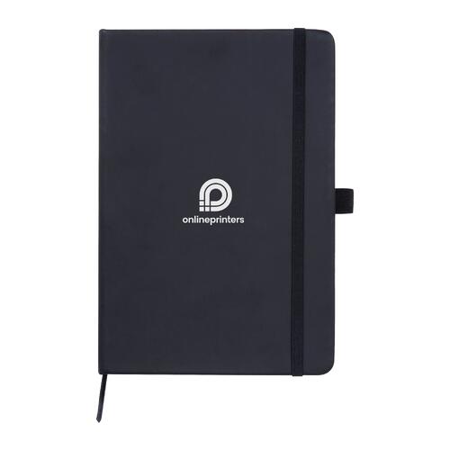 - A5-notitieboek met PU-omslag, bladwijzer, sluitelastiek, penlus en 120 gelinieerde pagina’s van steenpapier