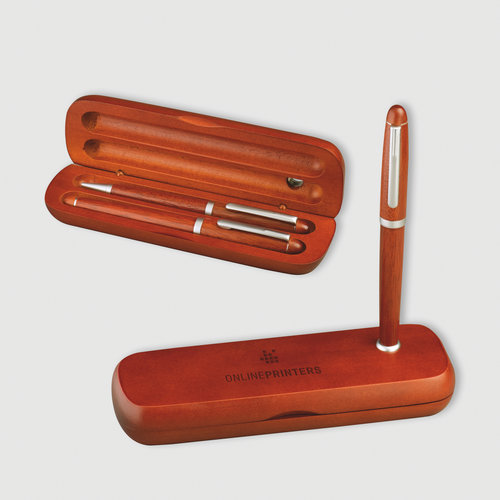 Houten schrijfsets in een houten doosje met balpenstaandaard
