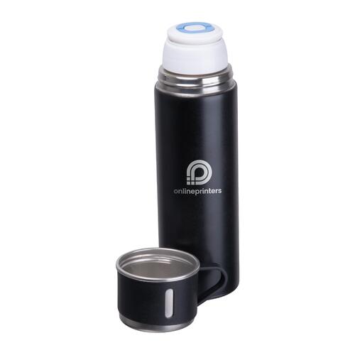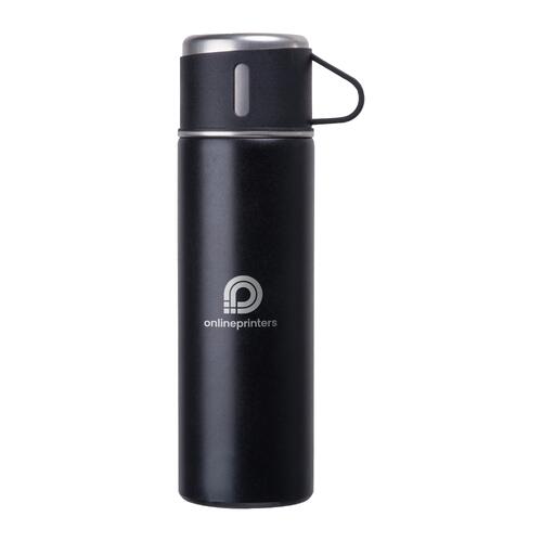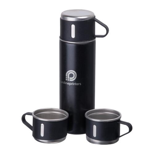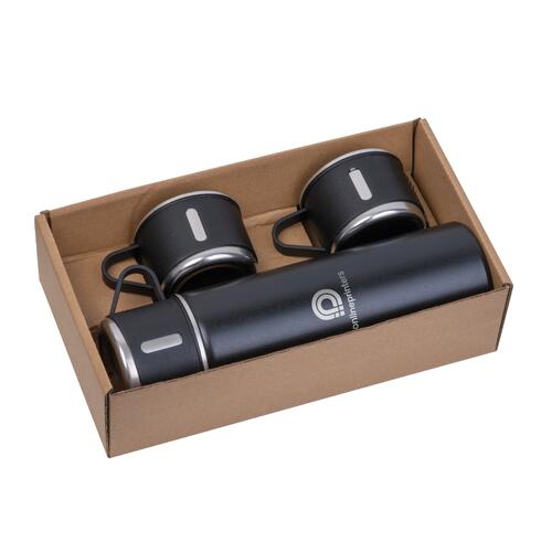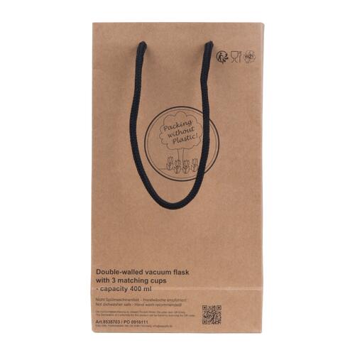 - Isolatieflessenset bestaande uit een dubbelwandige roestvrijstalen fles (400 ml) met snelsluiting en drie drinkbekers (120 ml) van roestvrij staal met kunststof omhulsel