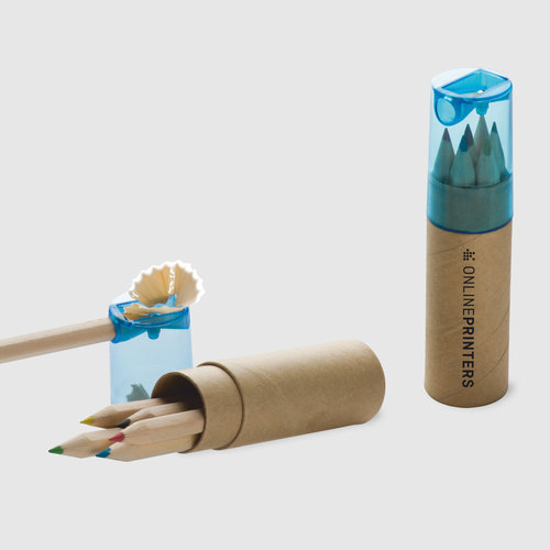 Informatie: 6 korte kleurpotloden, plastic potloodslijper