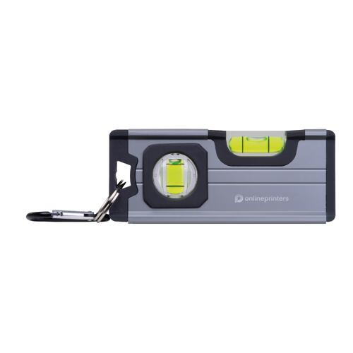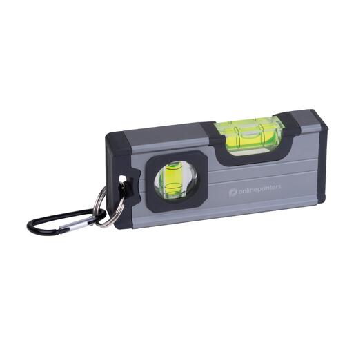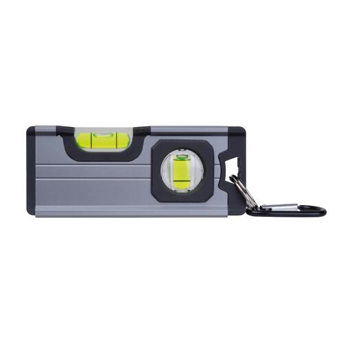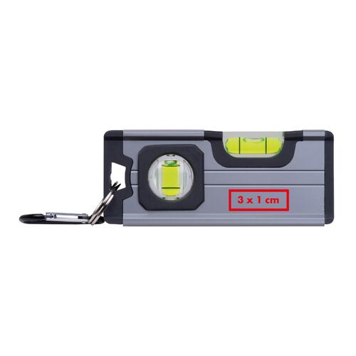 - Mini-waterpas van aluminium met kunststof accenten van ABS, twee libellen, magneet aan de onderzijde en een karabijnhaak