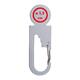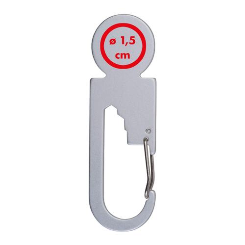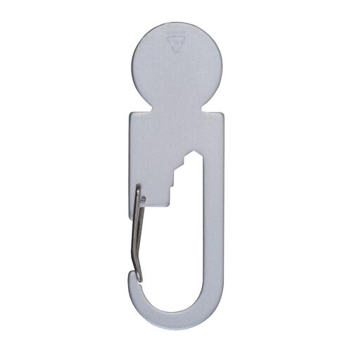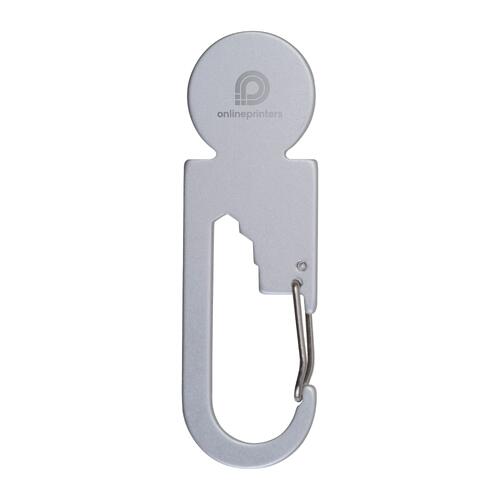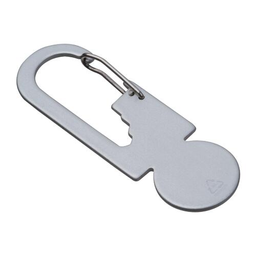 - Multitool van gerecycled aluminium met winkelwagenontgrendelaar, drie zeskantsleutels in verschillende maten en een karabijnhaak