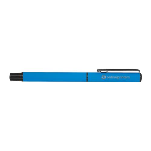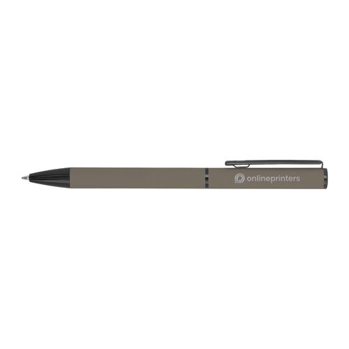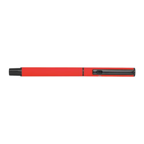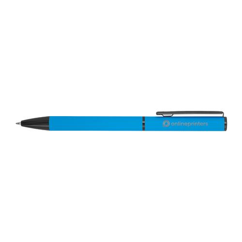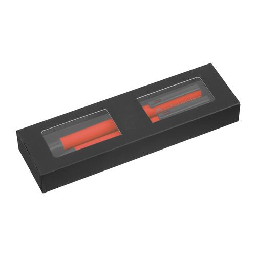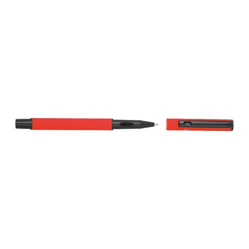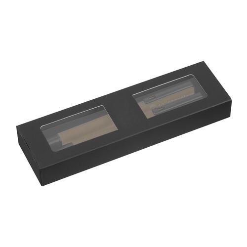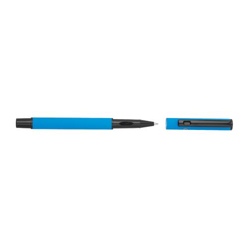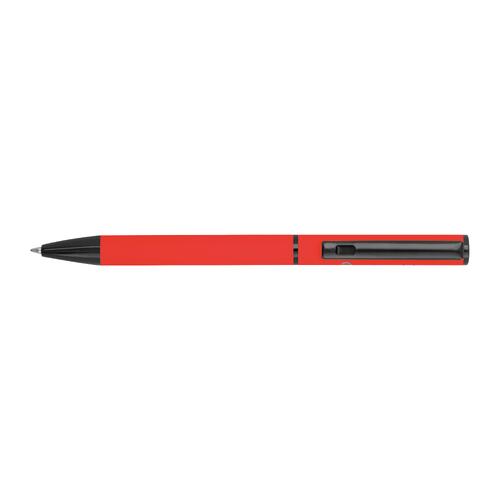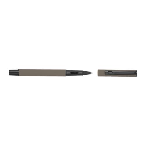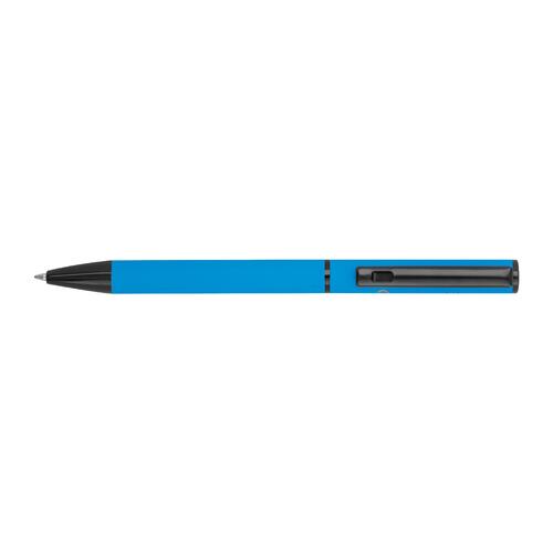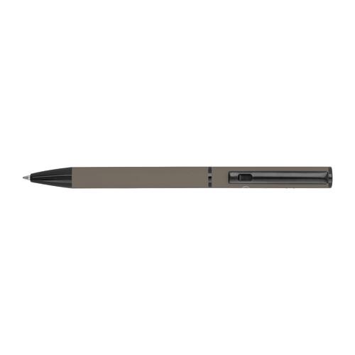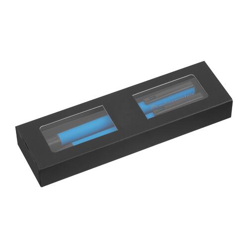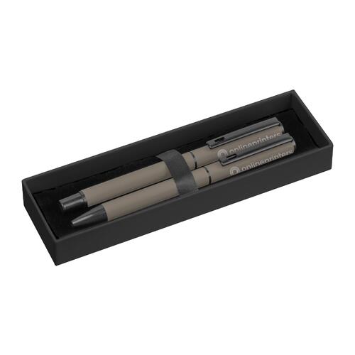 - Schrijfset van aluminium bestaande uit een rollerpen met zwarte inkt en een draaisysteem-balpen met blauwe inkt (kunststof vulling met groot volume), geleverd in een doos