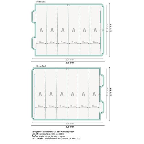 - Gegevensformaat (incl. 2 mm afloop): 29,8 x 21,4 cm